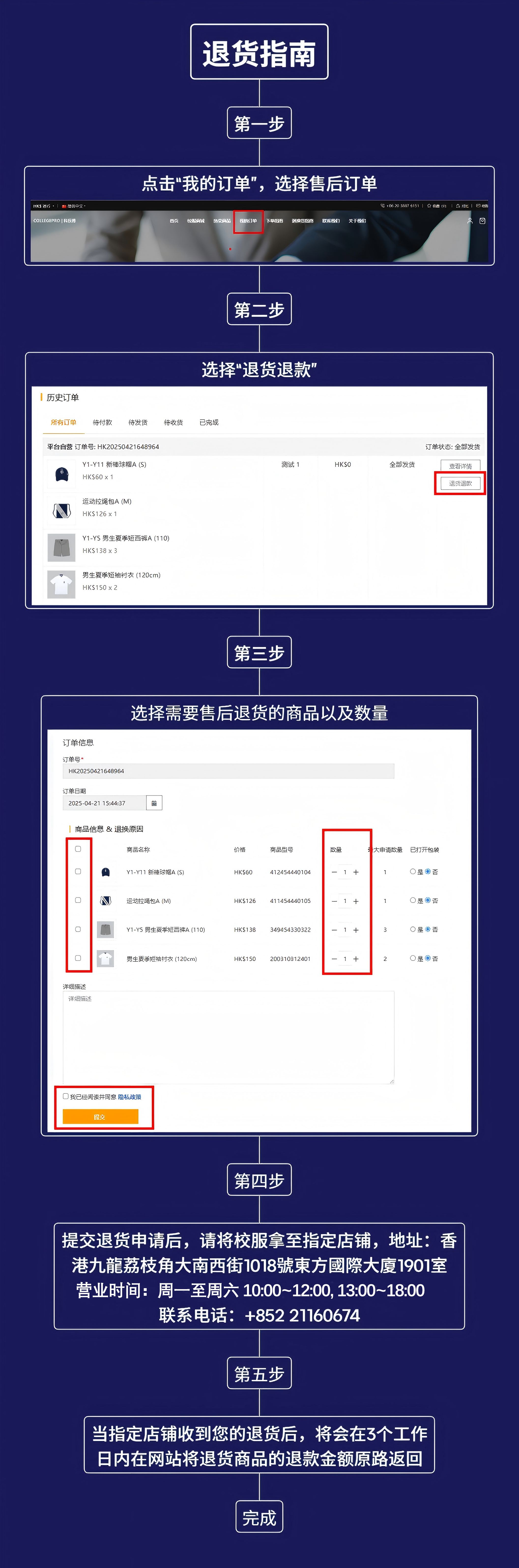 - 二、如需退货,请将校服拿至指定店铺:香港九龙荔枝角大南西街1018号东方国际大厦1901室,联系电话+852 21160674,工作时间:周一至周六 10:00~12:00,13:00~18:00(公众假期除外)